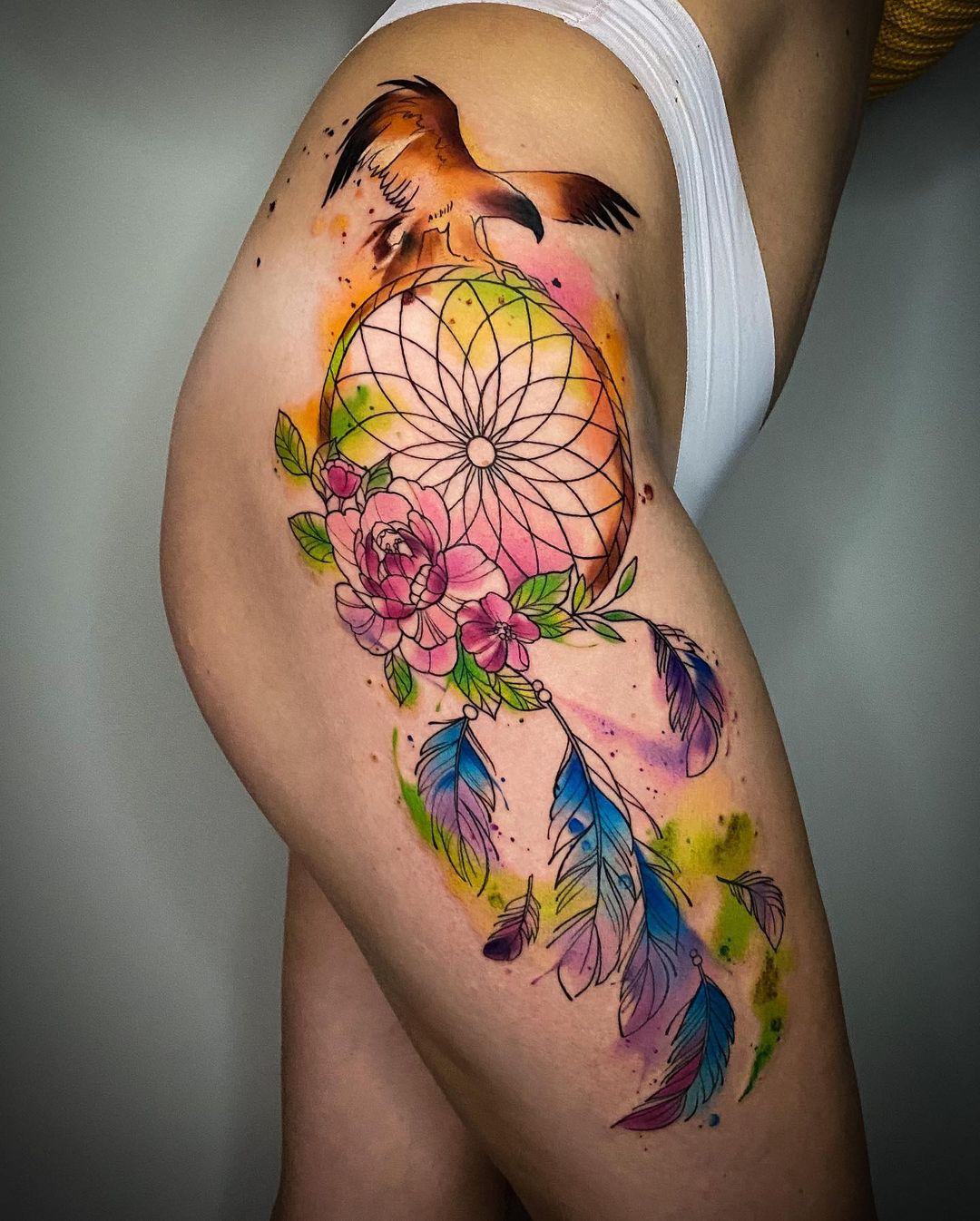 Tatuaż łapacz snów na udzie